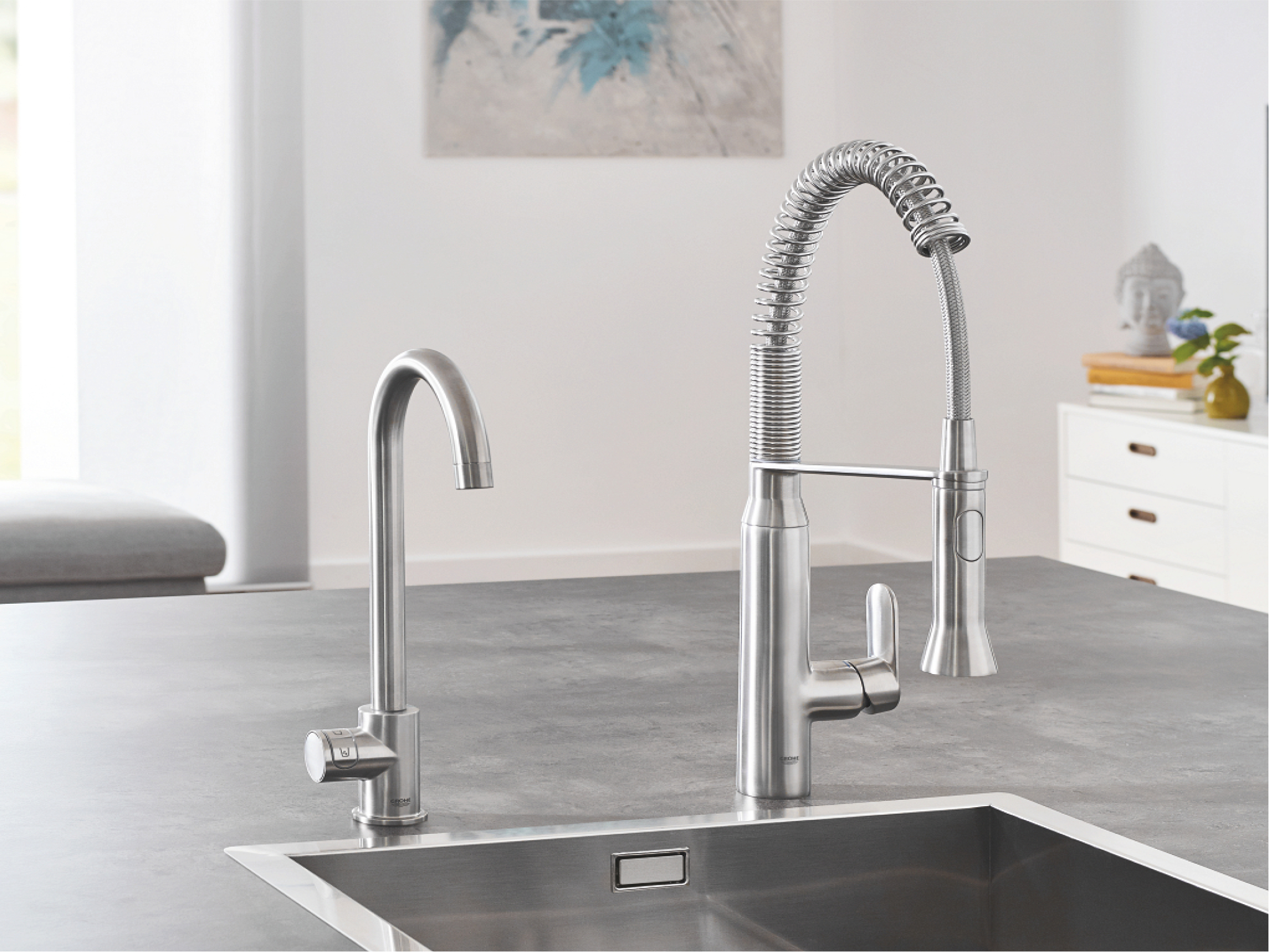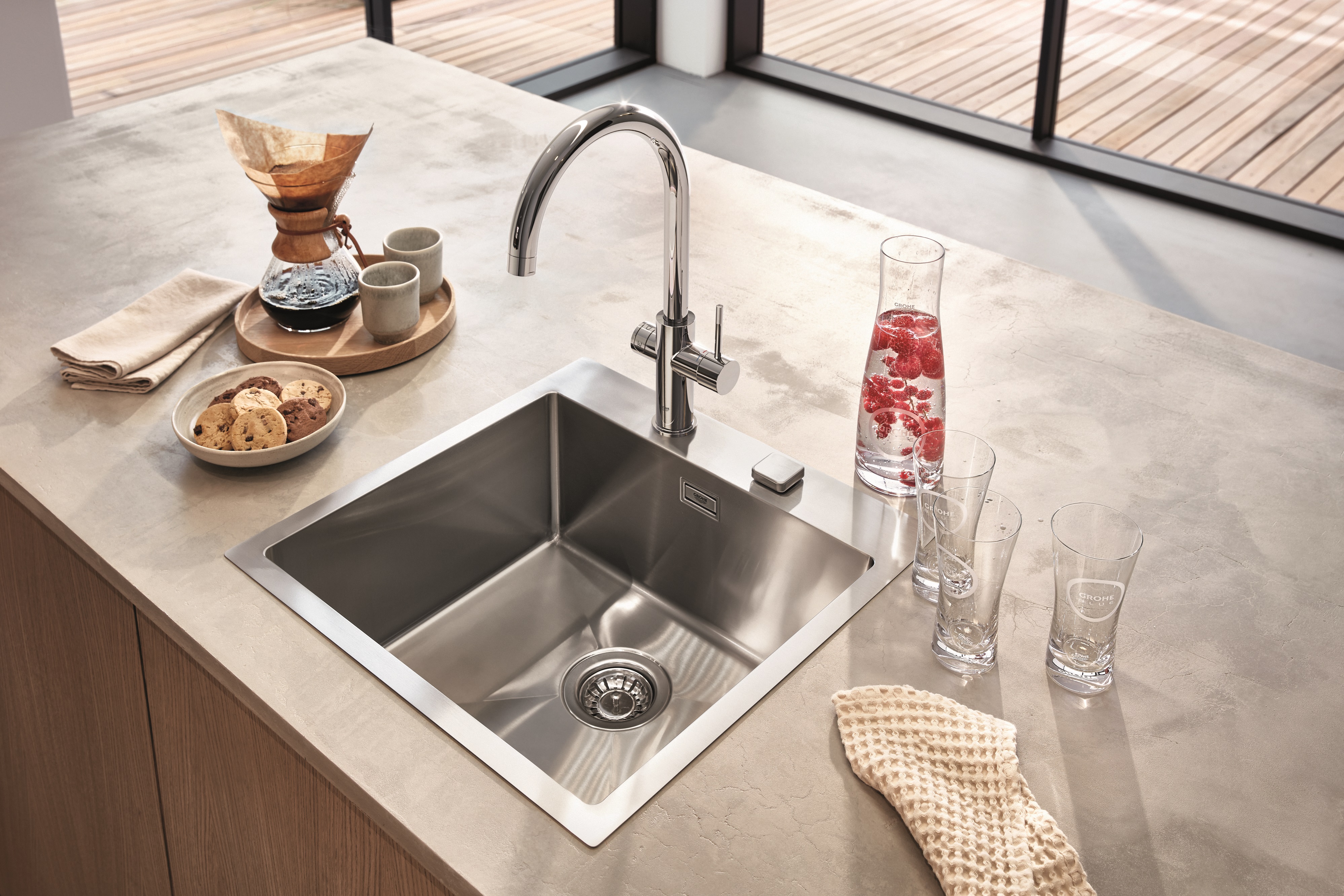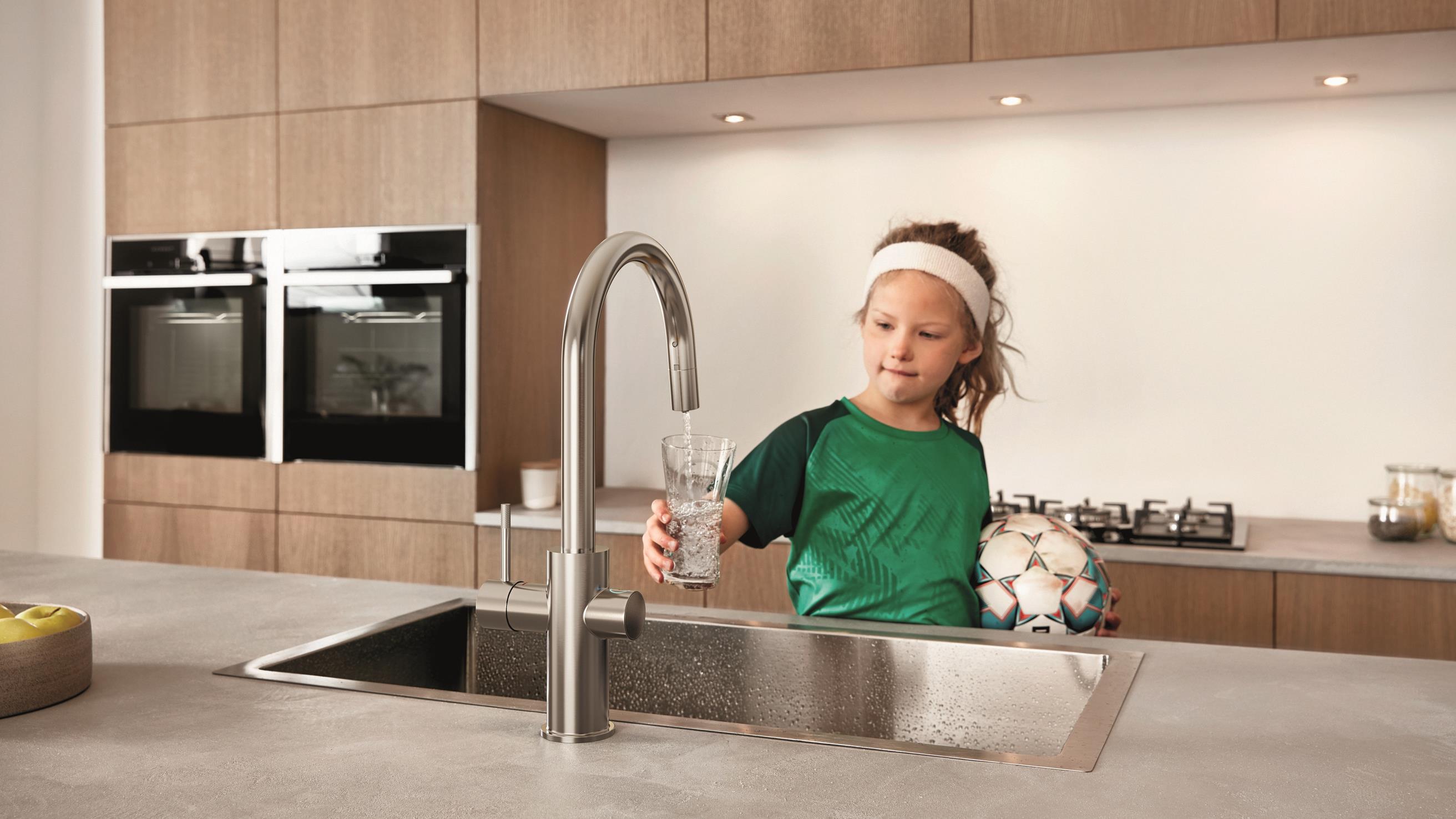 GROHE Blue Home ist die überlegene Lösung für Ihr Zuhause, optional mit herausziehbarem Mousseur und Steuerung per GROHE Wassersystems App.