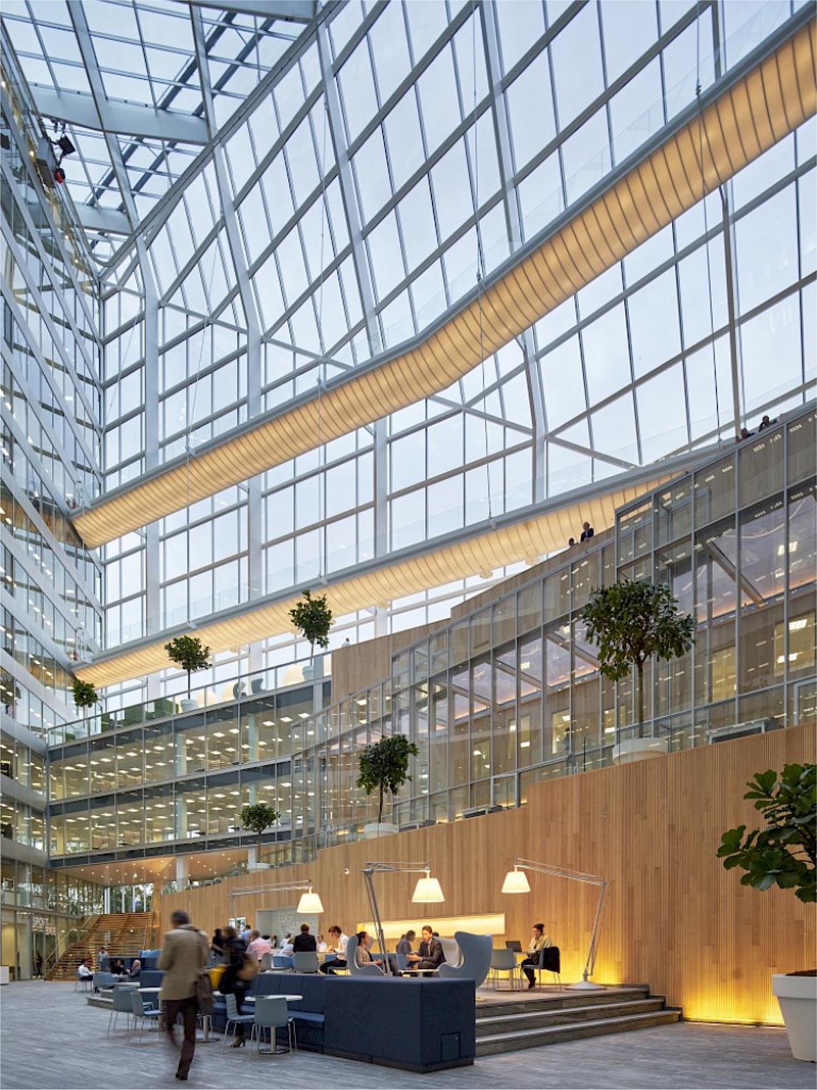 In einem Unternehmen, dessen Mitarbeiter sehr unterschiedlichen Tätigkeiten nachgehen, sollte die Architektur das Bewusstsein stärken, Teil eines Ganzen zu sein: Das Atrium mit Cafés und Restaurant, in dem sich alle Wege kreuzen, wurde zum Herzstück des Gebäudes. Ron Bakker bringt die neue Arbeitswelt auf den Punkt: "Man muss sich nur die Büros von Google und Microsoft anschauen: Sie sehen aus wie Hotellobbys". Mit Blick auf die Zukunft der Arbeit haben die Architekten gemeinsam mit Deloitte die Arbeitsabläufe unter die Lupe genommen und sich schließlich für "Hotdesking" (flexible Arbeitsplätze) entschieden: Es gibt nur 1.000 Schreibtische für 2.500 Mitarbeiter. Eine hauseigene App hilft den Mitarbeitern, täglich ihren Schreibtisch zu wählen, je nachdem, ob sie Ruhe oder Gesellschaft brauchen. "Die Mitarbeiter verbringen nur 30-40 Prozent ihrer Arbeitszeit am Schreibtisch, den Rest der Zeit sind sie in Meetings oder unterwegs. Es gibt nichts Nachhaltigeres, als etwas nicht zu bauen, das man nicht braucht", fasst Ron Bakker zusammen.