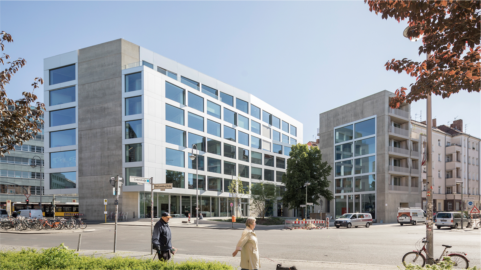 Transparenz und Offenheit waren für Bundschuh Architekten auch bei der Gestaltung der beiden übrigen Gebäude entscheidend. Im Erdgeschoss des Wohnhauses an der Linienstraße eröffnete der Galerist Daniel McLaughlin seine Filiale, ein paar Meter weiter, im Erdgeschoss des Verbindungsbaus, zog der niederländische Fahrradhersteller VanMoof mit seiner Berliner Niederlassung ein. Breite Fensterfronten ermöglichen den Passanten großzügige Ausblicke.